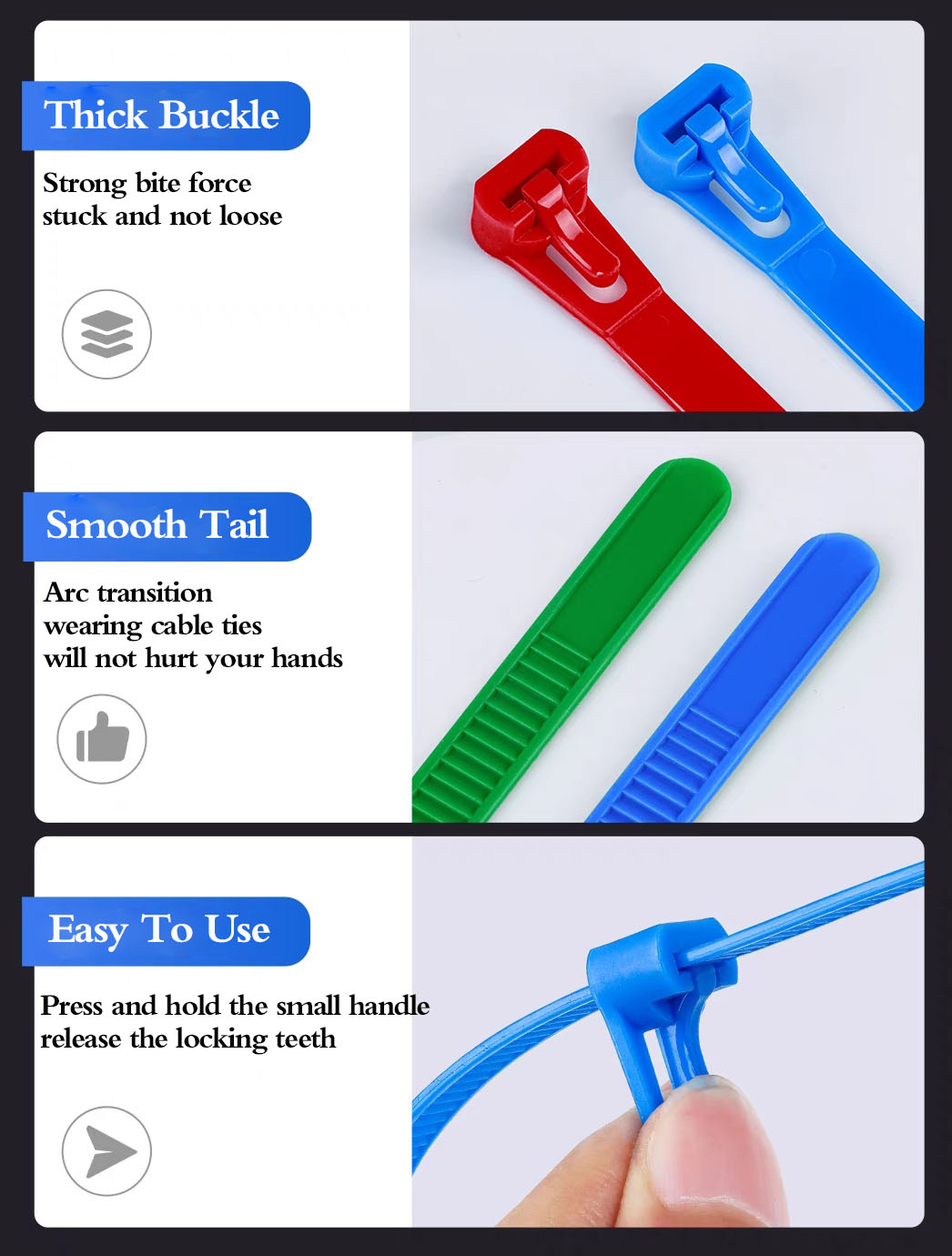 【SELVLÅSENDE SPENNE】 Hvert enkelt buntbånd har en slitesterk, selvlåsende spenne som låser svært godt og ikke løsner etter lang tids bruk, og låsetennene holder buntbåndet i ønsket lengde. Enkel å bruke og enkel å pakke sammen gjenstander med. Den selvlåsende spennekonstruksjonen gjør at vanlige kabelbindere kun kan brukes én gang, og den selvlåsende spennekonstruksjonen gjør kabelbinderne gjenbrukbare.