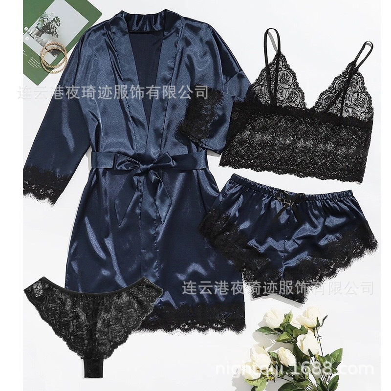 Settet er perfekt for en romantisk kveld i. Settet inkluderer en nattkjole, seler, shorts, alt i vakre blonder og satengstoff. Nattkjolen har en dyp V-hals og en gjennomskjært blondeoverdel med satengskjørt. Dette settet vil garantert få deg til å føle deg vakker og delikat.