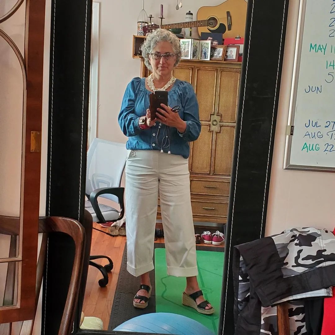 - Avslappet passform over hofte og lår med utsvungne ben