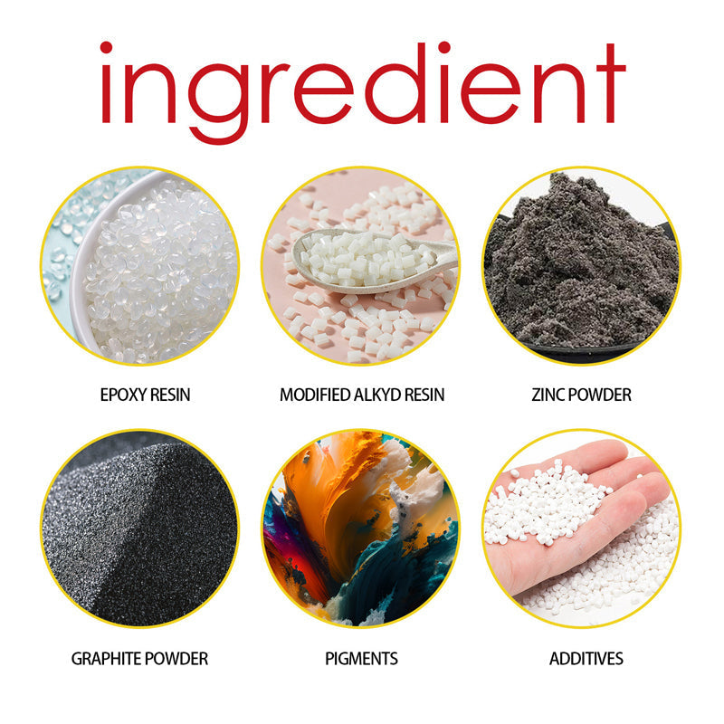 Ingredienser: Epoksyharpiks, modifisert alkydharpiks, sinkpulver, grafittpulver, pigmenter, tilsetningsstoffer.