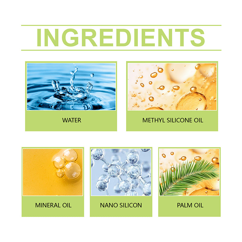 Hovedingredienser: Vann, nanosilisium, metylsilikonolje, mineralolje, palmeolje osv.